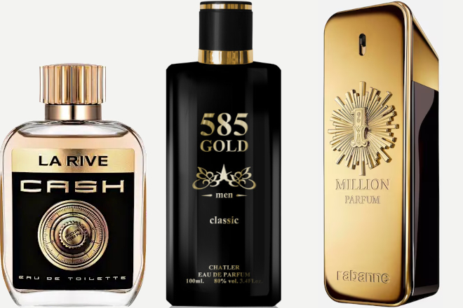 La Rive: Cash (edt) 100 ml – €7,45 | Chatler – 585 Gold Classic (edp) 30 ml – €5,99 | Rabanne – 1 Million (adviesprijs: €137,55 – 100 ml)
