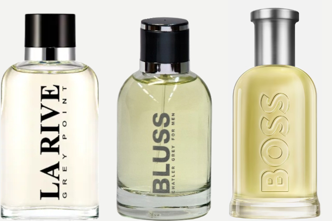 La Rive: Grey Point (edt) 90 ml – €7,45 | Chatler – Bluss Grey Men (edp) 30 ml – €5,99 | Hugo Boss Bottled (edt) (adviesprijs: €119 – 100 ml)