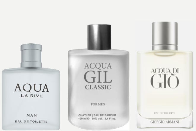 La Rive: Aqua (edt) 90 ml – €9,99 | Chatler – Acqua GIL Classic (edp) 30 ml – €5,99 | Giorgio Armani – Acqua di Giò (edt) (adviesprijs: €133 – 100 ml)