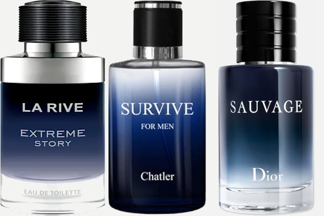 La Rive: Extreme Story (edp) 75 ml – €7,45 | Chatler – Survive (edp) 30 ml – €5,99 | Dior – Sauvage (adviesprijs: €96 – 60 ml)