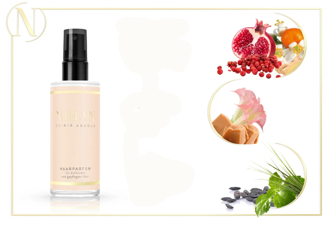 Het verleidelijk heerlijke NIHAN Elixir absolu haarparfum onthult delicate oranjebloesem gecombineerd met sappige granaatappel. Romige karamel vermengt zich moeiteloos met bloemige nuances en creëert een zachte sensualiteit die subtiel wordt verdiept door warme noten van tonkaboon en patchouli. Het elegante beige design weerspiegelt de verfijnde en sensuele essentie van de geur – een onweerstaanbare metgezel voor heerlijk geurend haar en een vleugje dagelijkse luxe.
